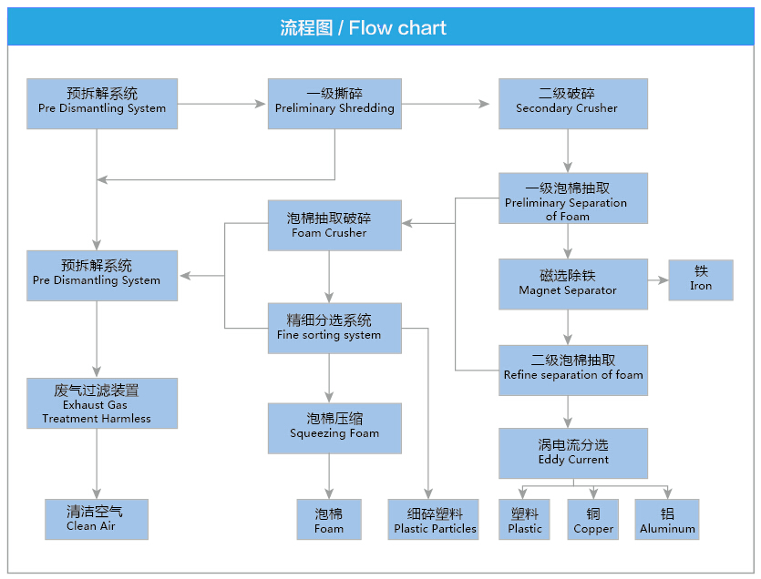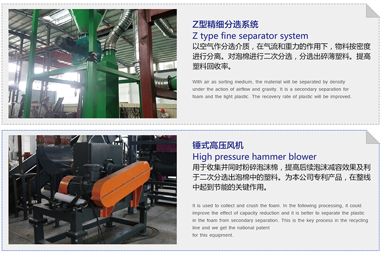 ● 能耗低。泡棉的抽取與破碎采用自主研發(fā)的專利設(shè)備—高壓錘片風(fēng)機(jī);