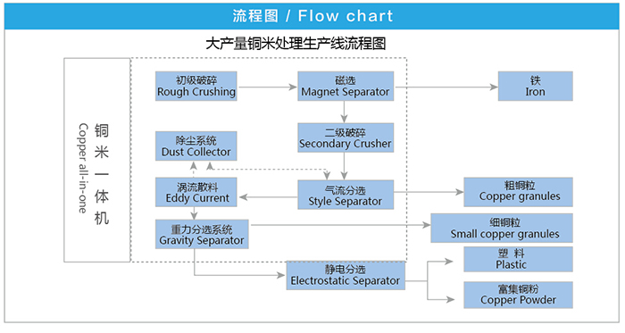 規(guī)格齊全的綜合性銅米一體機(jī)專門處理雜線,不需前期大量人工分類廢電線電纜,對(duì)主級(jí)線及低含銅量的電線也能得到很好的分選效果。