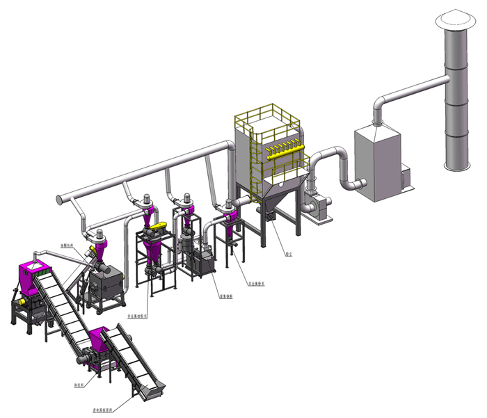 將廢PCB板粉碎到一定粒徑,通過分級及分離分選設(shè)備將金屬粉體和非金屬粉體有效地分離,生產(chǎn)過程中其產(chǎn)生的粉塵和廢氣將分別通過脈沖布袋除塵器和廢氣凈化裝置等環(huán)保設(shè)施處理達(dá)標(biāo)后對空排放。