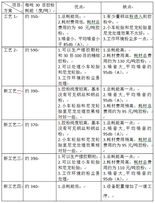 3E機(jī)械通過(guò)這幾年面對(duì)不同客戶的需求設(shè)計(jì)定制了這些方案,與國(guó)內(nèi)常用的工藝1比較,在能耗方面只有新工藝四能耗稍低,而其他新工藝在能耗和耗材方面,都要比工藝1高,但是如果面對(duì)客戶既要得到橡膠顆粒和橡膠粉以及40目以上的橡膠粉,或者客戶處理小車輪胎和尼龍?zhí)?,那其他工藝又有它的?yōu)勢(shì),因此需根據(jù)客戶實(shí)際情況來(lái)配置設(shè)備。