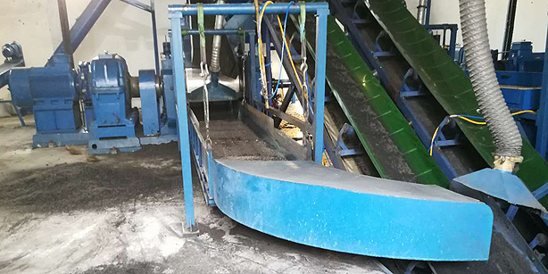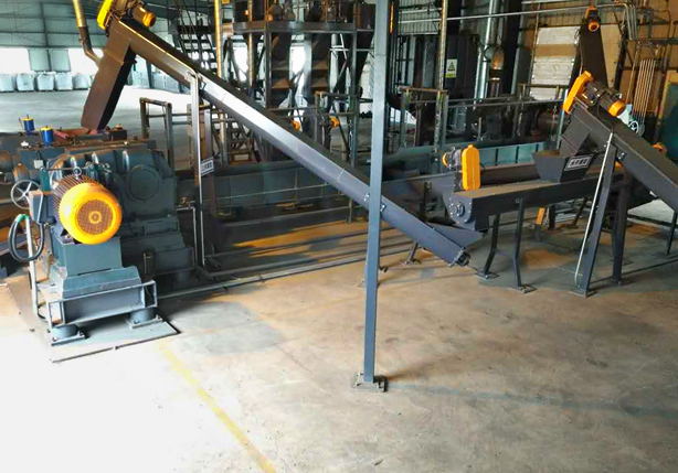 新工藝二:雙軸撕碎機(jī)(出料50X50mm膠塊)+鋼絲分離機(jī)(或叫中碎機(jī))(出料15mm膠粒)+雙溝輥破膠機(jī);