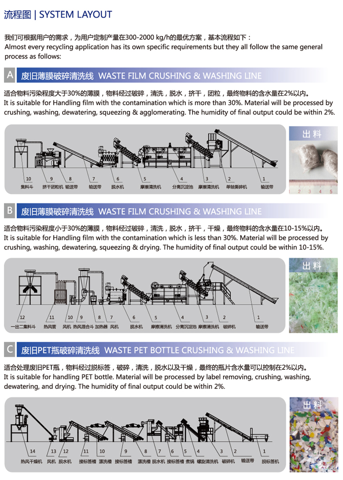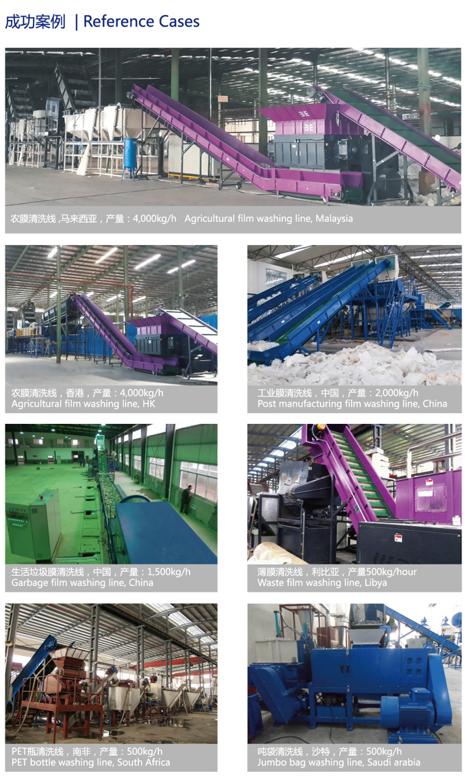 適用于不同污染程度的PE/PP薄膜、生活垃圾塑料、廢舊農(nóng)膜地膜大棚膜、工業(yè)包裝膜、工業(yè)廢棄膜、PET瓶等廢料的破碎、清洗、分離、干燥、包裝,把廢舊塑料變成可循環(huán)再利用的原料。整條生產(chǎn)線從廢料到成品,具有操作簡易,效率高,環(huán)保,節(jié)能等特點(diǎn)。
