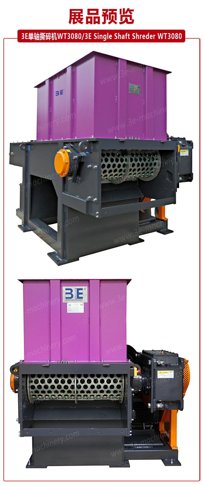 3E單軸撕碎機(jī)WT3080屬于常用的中小型單軸撕碎機(jī),適用于撕碎多種形狀大小不一的膠頭料,塑料板材,塑料桶,PET瓶,塑料膜,紙張,電路板,橡膠,木材,家用電器,電纜等??蛻艨筛鶕?jù)物料和處理量的需求來選擇相應(yīng)的刀輥。