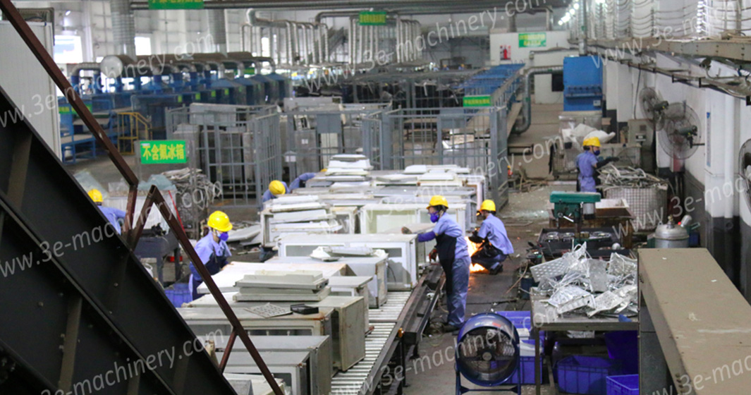 3E機(jī)械廢舊冰箱回收處理生產(chǎn)線,針對(duì)大容量冰箱及冰柜的破碎回收,設(shè)計(jì)獨(dú)特并獲得國(guó)家專利(ZL 2017 1 0005788.9),分選效果高,物料、粉塵及排氣分別進(jìn)行,獨(dú)立抽風(fēng)系統(tǒng),有利于環(huán)保及生產(chǎn)安全。