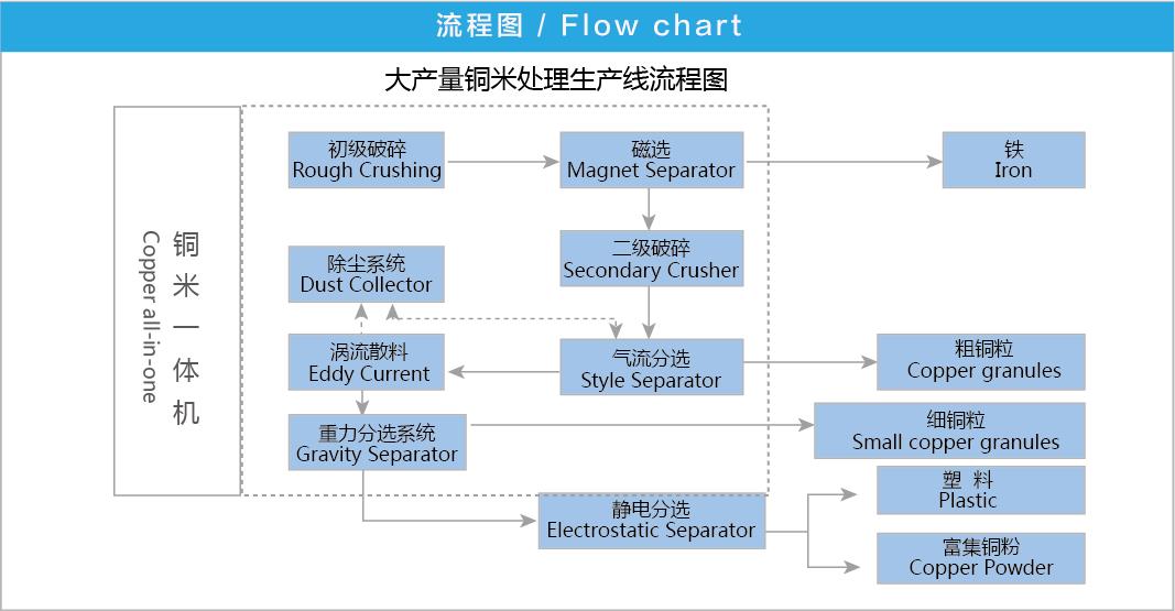 銅米一體機(jī)不需前期大 量人工分類廢電線電纜,對(duì)主級(jí)線及低含銅量的電線也能得到很好的分選效果。 |